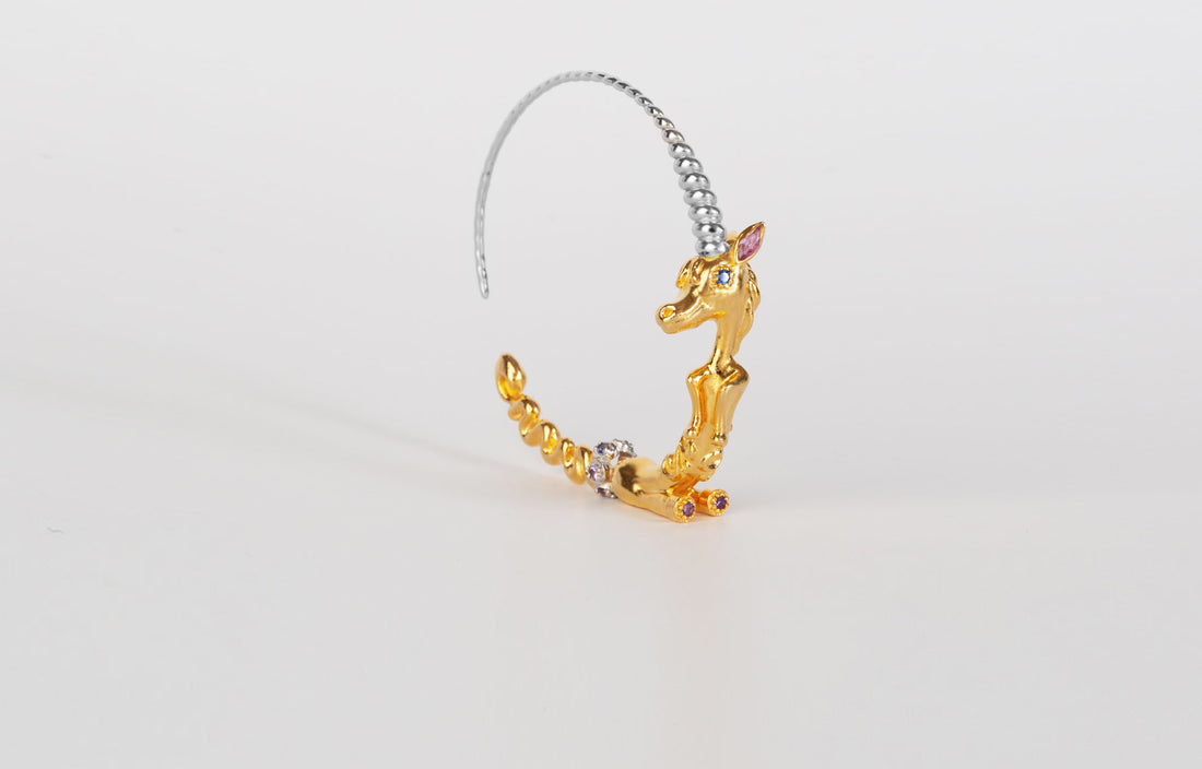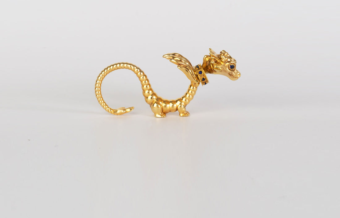 A reimagination of the traditional dragon. Our Dragonne is chic and - for a change - feminine. She wears a playful smile always interacting with the wearer. Each Dragonne in the collection is art jewelry; designed to adorn the body and also stand on its own feet as a sculpture.